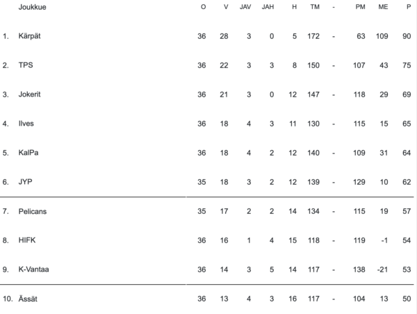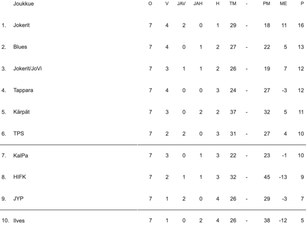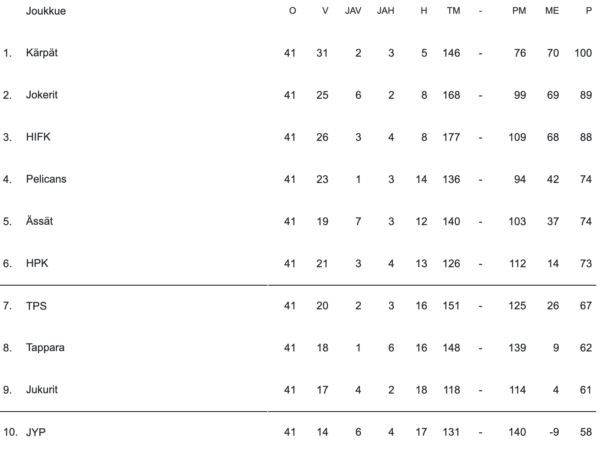 Kollit jatkaa sarjassa kolmantena, mutta ero toiseen sijaan ja Jokereihin kaventui yhteen pisteeseen.