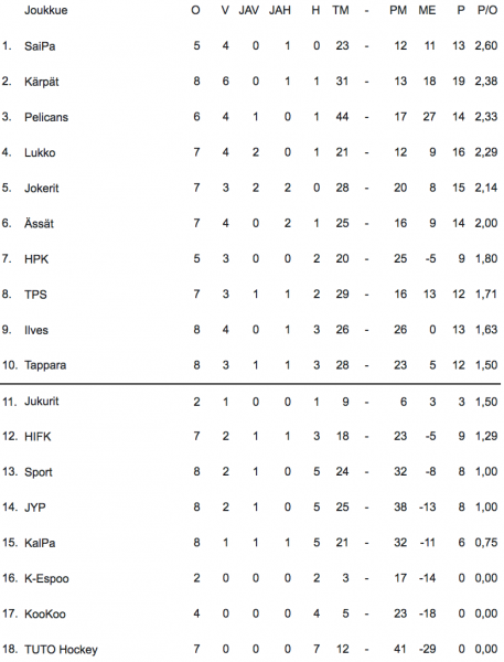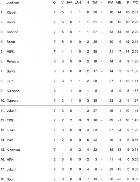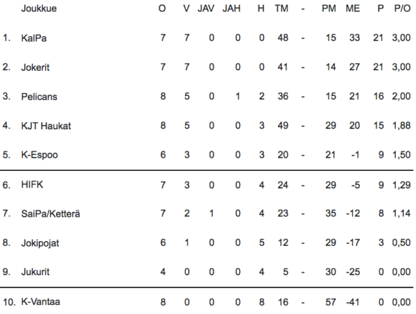 Kaudella 2020–21 joukkueiden järjestys sarjataulukossa määräytyy pistekeskiarvon (pisteet/ottelu) mukaan. Lisätietoja täällä. Sarjataulukko päivittyy otteluiden päättyessä. O = ottelut, V = voitot, JAV = jatkoaikavoitot, JAH = jatkoaikahäviöt, H = häviöt, TM = tehdyt maalit, PM = päästetyt maalit, ME = maaliero, P = pisteet, P/O = pisteet/ottelu.