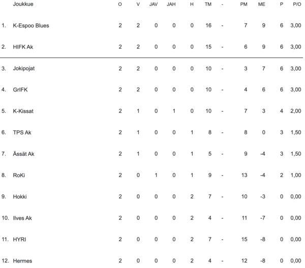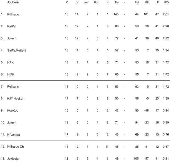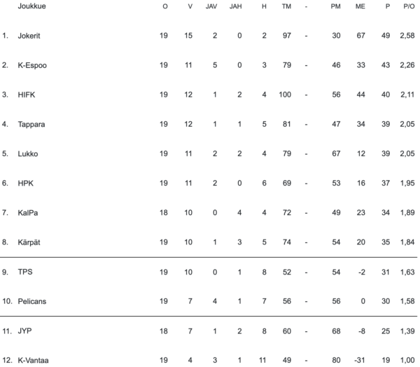 Alkusarjassa ansaitut sarjapisteet säilyivät varsinaiseen SM-sarjaan. Jokerit onnistui viikonlopun esityksellään nousemaan tasapisteisiin Kollien kanssa. Kollit jatkaa uuteen viikoon sarjan sijalta kolme.