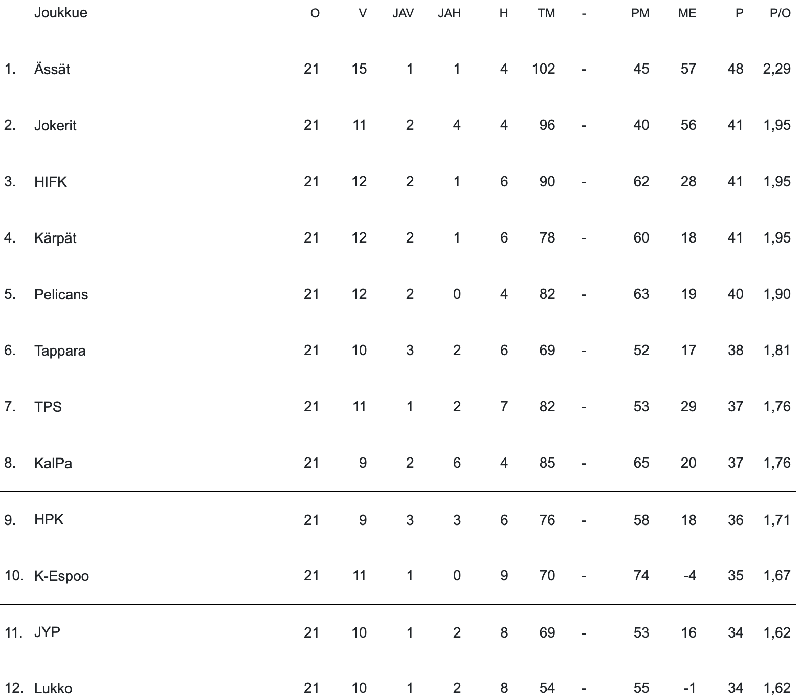Alkusarjassa ansaitut sarjapisteet säilyivät varsinaiseen SM-sarjaan. Jokerit onnistui viikonlopun esityksellään nousemaan tasapisteisiin Kollien kanssa. Kollit jatkaa uuteen viikoon sarjan sijalta kolme.
