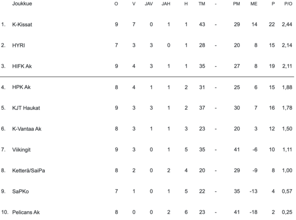 HIFK:n U18 Akatemia pelasi myös yhden matsin menneellä viikolla. Sunnuntaina käyty ottelu Vuosaaren Viikinkejä vastaan tarjosi peräti 12 maalia. Ottelun kaksi ensimmäistä erää joukkueet onnistuivat maalinteossa lähes vuorotahtiin, mutta kolmannen erän viimeinen kymppi ratkaisi voiton HIFK:lle. Kotijoukkue karkasi jo neljän maalin johtoon ajassa 53:44, eikä Viikingit enää päässyt voitosta taistelemaan.