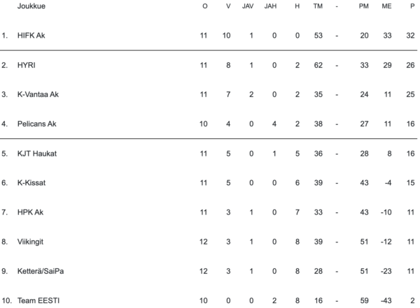 HIFK Akatemia jatkaa voittamattomana Mestiksen alkusarjan piikkipaikalla. Menneenä viikonloppuna joukkue koki kuitenkin kauden ensimmäisen pistemenetyksen, voitettuaan Pelicans Akatemian vasta voittolaukauksilla.