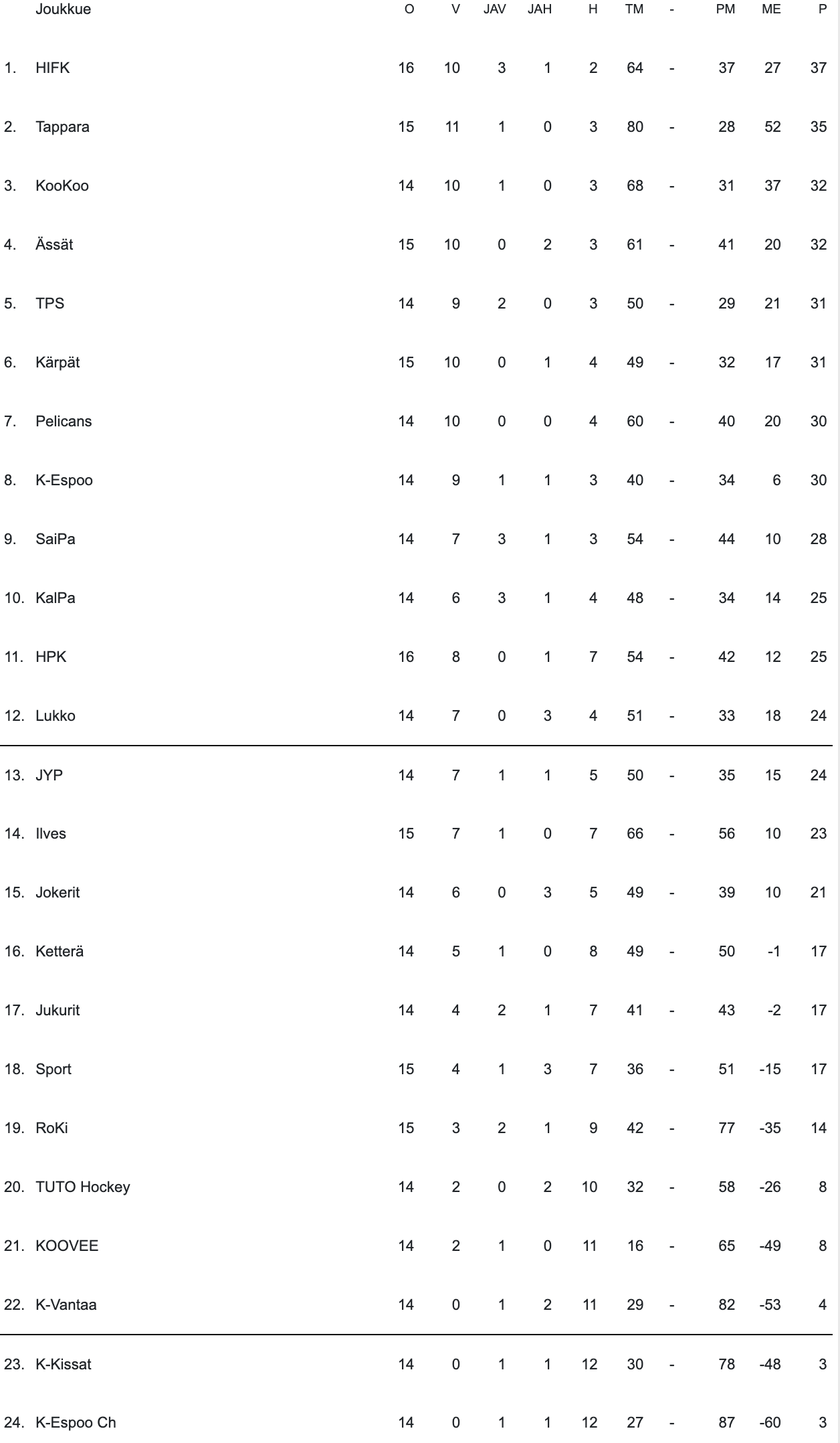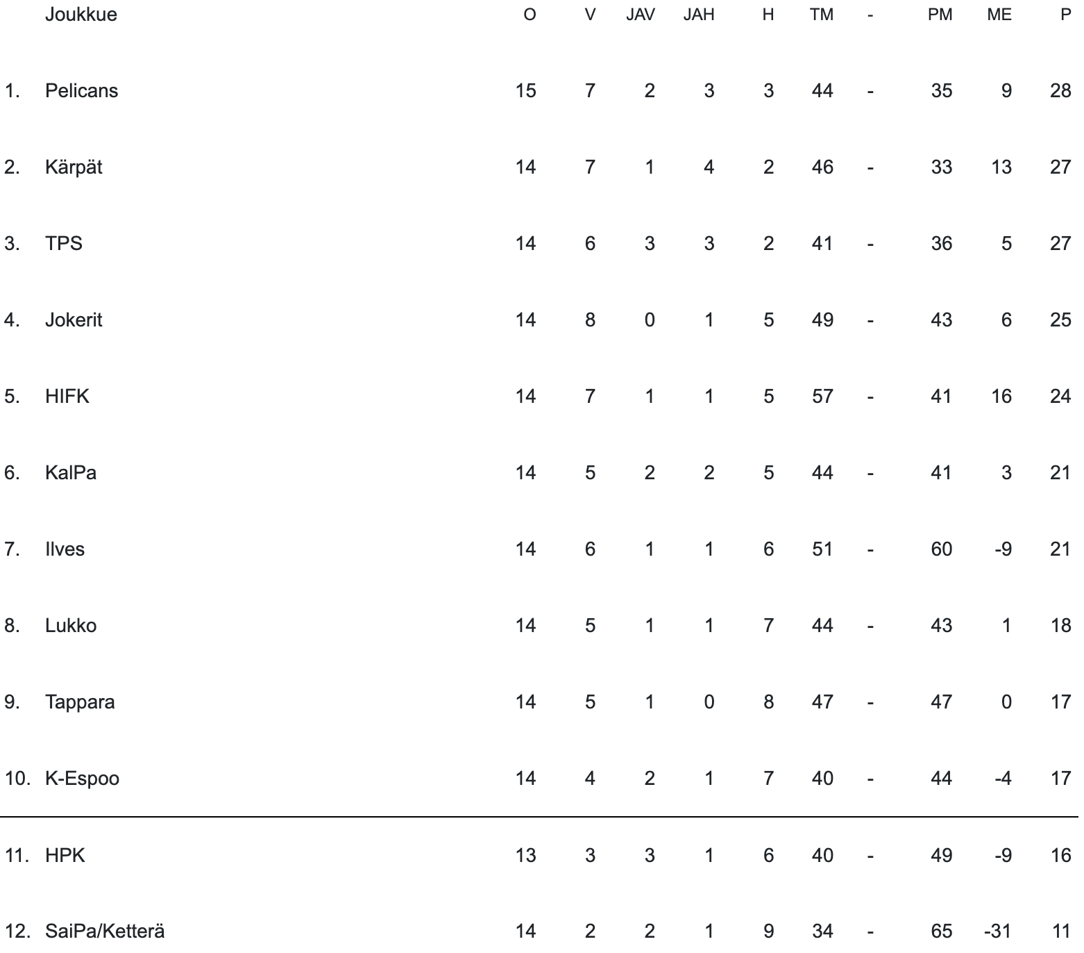 12:45 | Ketterä/SaiPa | – | HIFK Ak |