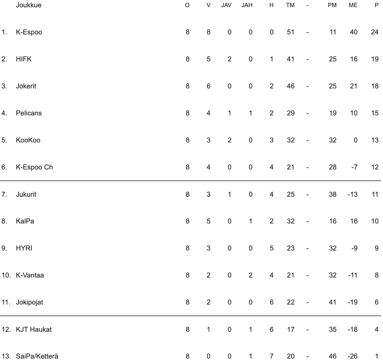 HIFK Akatemia jatkaa voittamattomana Mestiksen alkusarjan piikkipaikalla. Menneenä viikonloppuna joukkue koki kuitenkin kauden ensimmäisen pistemenetyksen, voitettuaan Pelicans Akatemian vasta voittolaukauksilla.