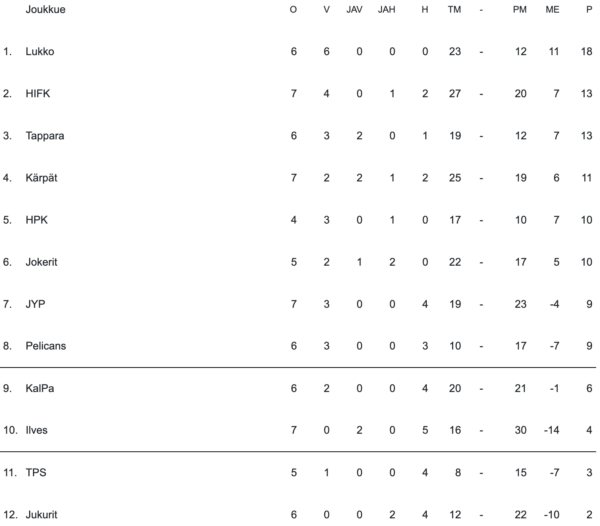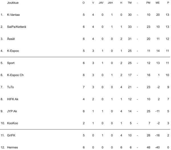 15:00 | SaiPa/Ketterä | – | HIFK Ak |