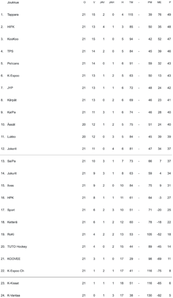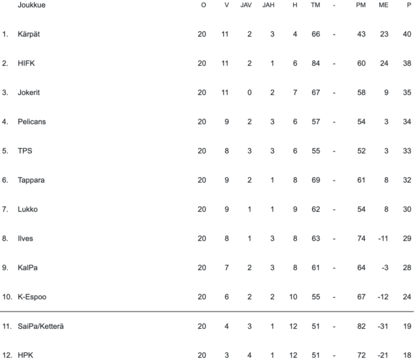 15:00 | SaiPa/Ketterä | – | HIFK |