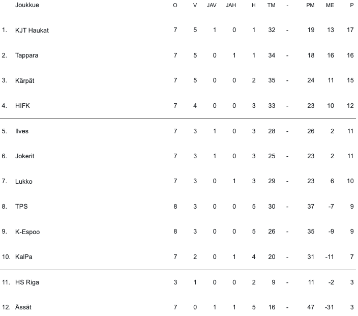 HIFK:n alle 18-vuotiaat pelasivat niin ikään kahdesti viime viikolla. Kotiotteluista pisteitä kertyi neljä ja johto sarjan kärjessä kasvoi. Sarjapelit jatkuvat tammikuussa loppuvuoden maajoukkueturnauksista johtuen.