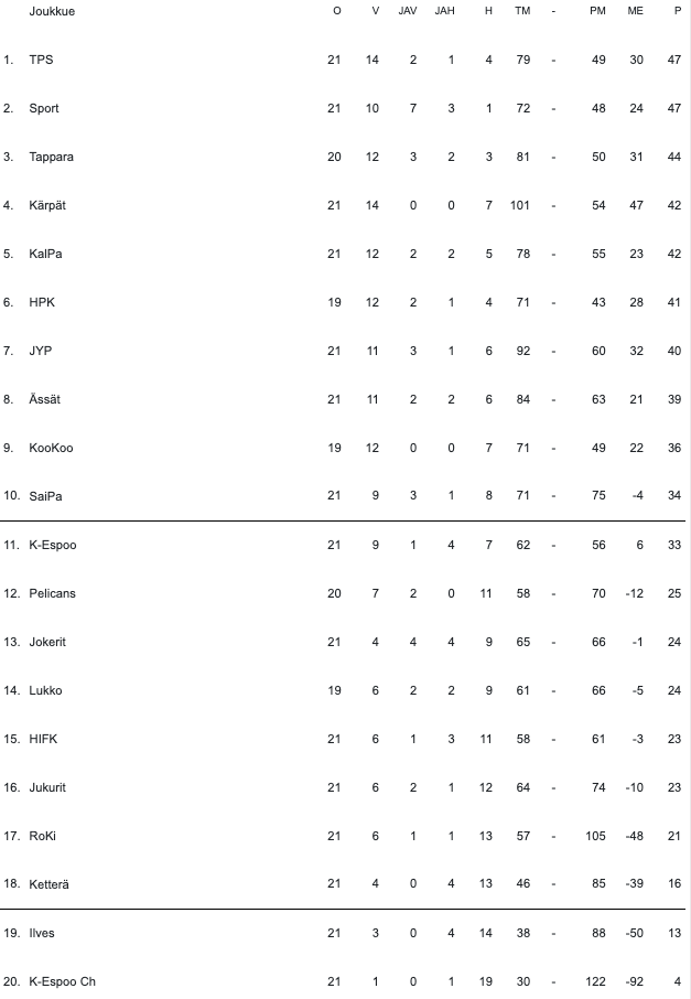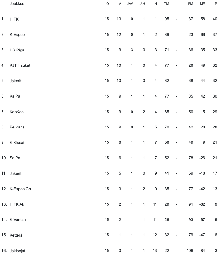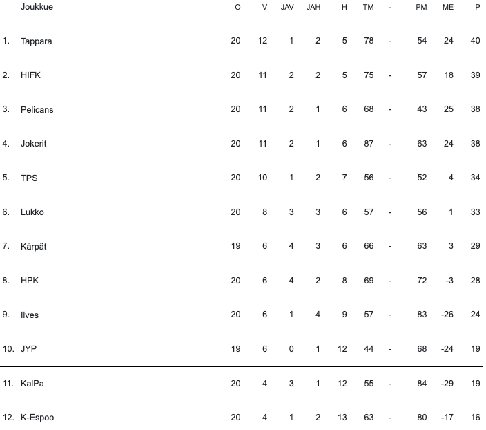 – Nyt pieni tauko peleistä. Saadaan testit tehtyä ja otettua vähän happeakin. Sitten pari vikaa alkusarjan matsia KalPaa ja JYPiä vastaan, joissa tottakai lähdemme tekemään parhaamme ja sitten nähdään riittääkö se piikkipaikalle.