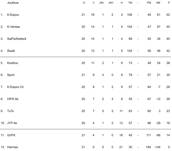 18:15 | K-Espoo Ch | – | HIFK Ak | |