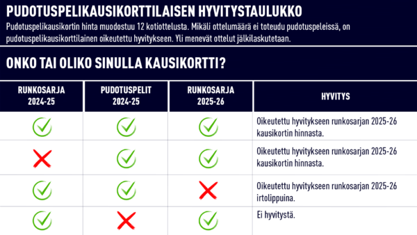 Uudet kortinhaltijat: Kausikorttiin mahdollisesti jäävät pelaamattomat ottelut hyvitetään tulevan kauden kausikortista. Mahdollisia pudotuspeleissä jääneitä pelaamattomia otteluita ei hyvitetä uusille kortinhaltijoille, jos ei ota kauden 25–26 kausikorttia.