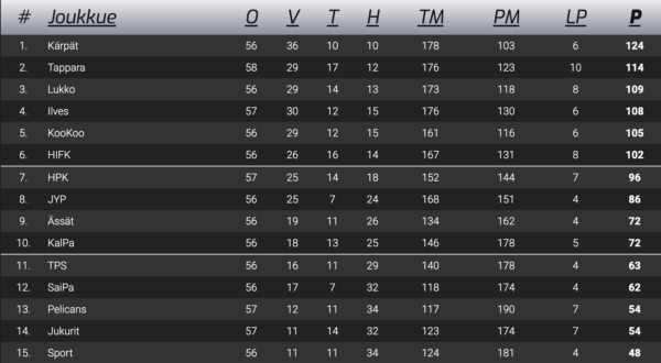 Koko sarjan pistepörssin kärkipaikalta löytyy tällä hetkellä Ilves-kapteeni Eemeli Suomi. Tehoja 24-vuotias hyökkääjä on kerännyt 55 pelaamassaan ottelussa 25+28=53. Ilveksen oma kasvatti on jo tässä vaiheessa parantanut entistä piste-ennätystään yli kymmenellä tehopisteellä.