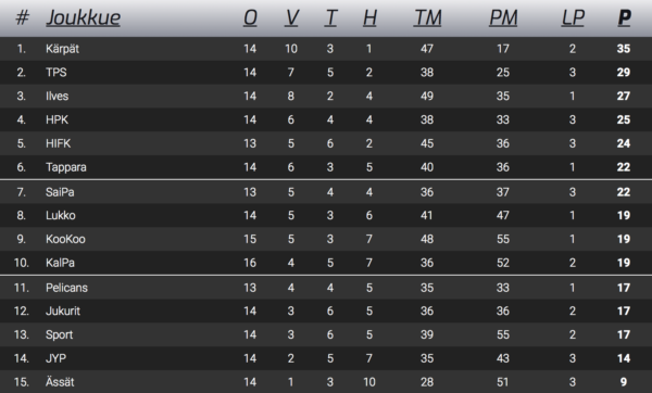 Loukkaantuneet: Aleksi Laakso (4 vk), Juho Keränen (4 kk), Erik Thorell (2-4 vk), Lennart Petrell (2-4 vk)