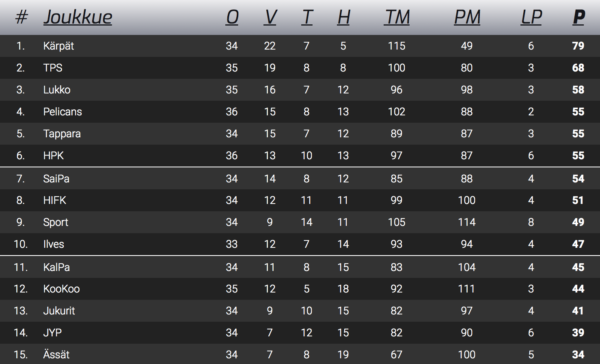 Loukkaantuneet: Teemu Tallberg (7–9 viikkoa), Juho Keränen (5 viikkoa), Micke Åsten (day-to-day), Niklas Nordgren (toistaiseksi), Thomas Nykopp (sivussa loppukauden), Iikka Kangasniemi (1-2 vk)