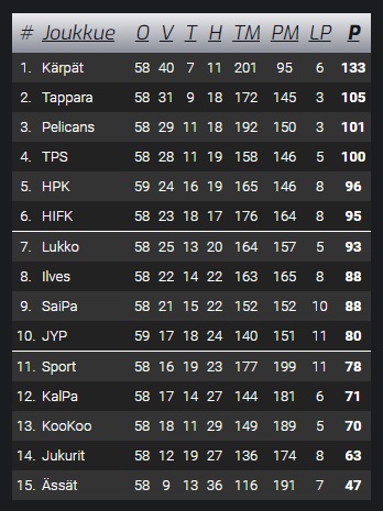 - HPK on lähimpiä kilpailijoitaan heikommassa asemassa siksi, että sillä on vain yksi ottelu pelaamatta. Jos Tapparaa vastaan ei tule torstaina pisteitä, paikka kuuden joukossa on tiukassa.