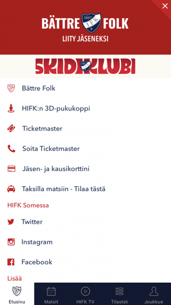– Avaa HIFK:n mobiilisovelluksen valikko (oikeasta yläkulmasta)