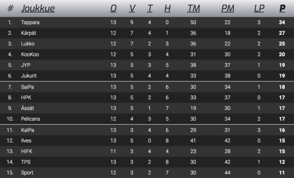 Loukkaantuneet: Atte Engren (1 viikkoa), Roope Taponen (1-2 viikkoa), Markus Kankaanperä (2-4 viikkoa), Joonas Lyytinen (day-to-day), Iikka Kangasniemi (day-to-day), Thomas Nykopp (6-8 viikkoa)