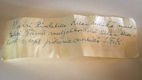 Seuran logolla koristeltuja esineitä oli esillä Artjärvellä ja nuori Rindell ihasteli niitä säännöllisesti vieraillessaan Allan-sedän luona.