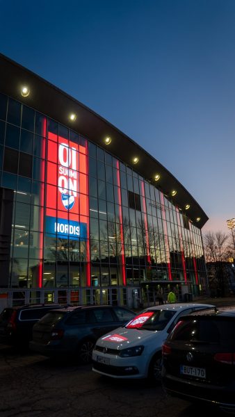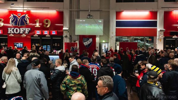 Huuhkajien matsi näytettiin suorana hallin käytävillä illan lätkämatsin ohessa sekä mediakuutiolla erätaukojen aikana.
