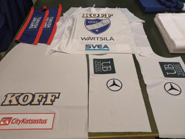 Meillä on puolivalmiit paidat jokaisesta koosta koko ajan valmiina. Runko, selkä ja hihat ovat valmiina ilman numeroa ja nimeä. Esimerkiksi viime kaudella tuli joku pelaaja syksyllä joukkueeseen niin, että yhden maissa päivällä saatiin tieto. Me laitettiin koneet laulamaan ja tavattiin parin tunnin päästä huoltaja Eläintarhan Nesteellä ja paita saatiin kuin saatiinkin pelaajalle illan vieraspeliin Hämeenlinnaan, kertoo Vuolasvirta työn ajoittaisesta hektisyydestä.
