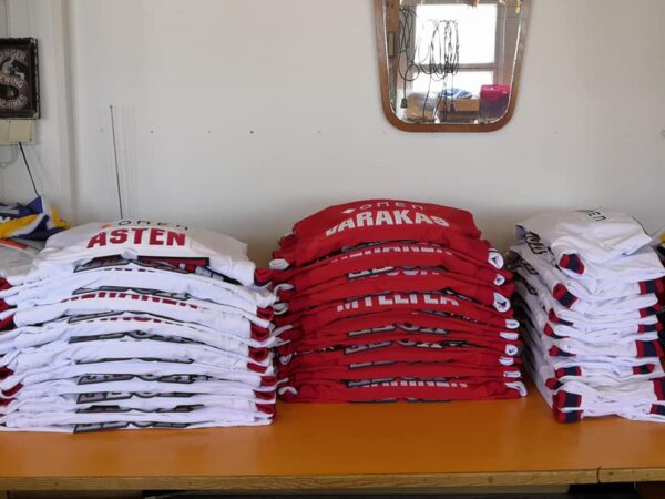 Meillä on puolivalmiit paidat jokaisesta koosta koko ajan valmiina. Runko, selkä ja hihat ovat valmiina ilman numeroa ja nimeä. Esimerkiksi viime kaudella tuli joku pelaaja syksyllä joukkueeseen niin, että yhden maissa päivällä saatiin tieto. Me laitettiin koneet laulamaan ja tavattiin parin tunnin päästä huoltaja Eläintarhan Nesteellä ja paita saatiin kuin saatiinkin pelaajalle illan vieraspeliin Hämeenlinnaan, kertoo Vuolasvirta työn ajoittaisesta hektisyydestä.