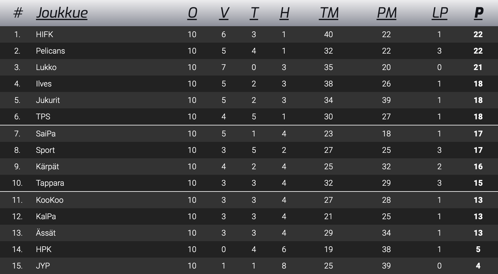 Kauden ensimmäisen kolmanneksen jälkeen HIFK on kavunnut sarjataulukossa sijalle neljä.