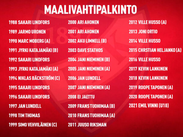Vasta 15 vuotta kauden aikana täyttänyt maalivahti Emil Vinni oli U18-sarjan parhaita maalivahteja. SM-alkusarjan pelit päättyivät Vinnin osalta marraskuun lopulla kahteen nollapeliin. Koko kauden vertailussa Vinni oli tilastoykkönen torjuntaprosentilla mitaten lukemalla 93,4.