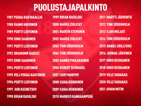 | Kausi | MVP | Puolustaja | Taistelija | Tulokas | Maalivahti | Gentleman (ASM/U20) |