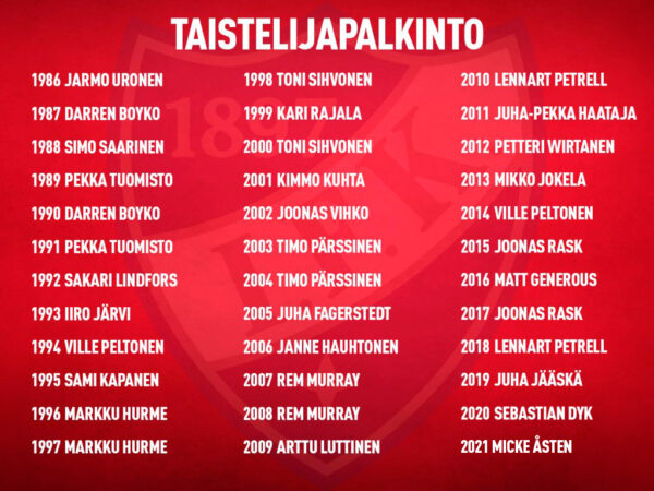 Ville Peltonen on puolestaan ainoa pelaaja, joka on palkittu kaikissa mahdollisissa kategorioissa (A-nuorten Gentleman 1991, tulokas 1993, taistelija 1994 & 2014, MVP 2011).