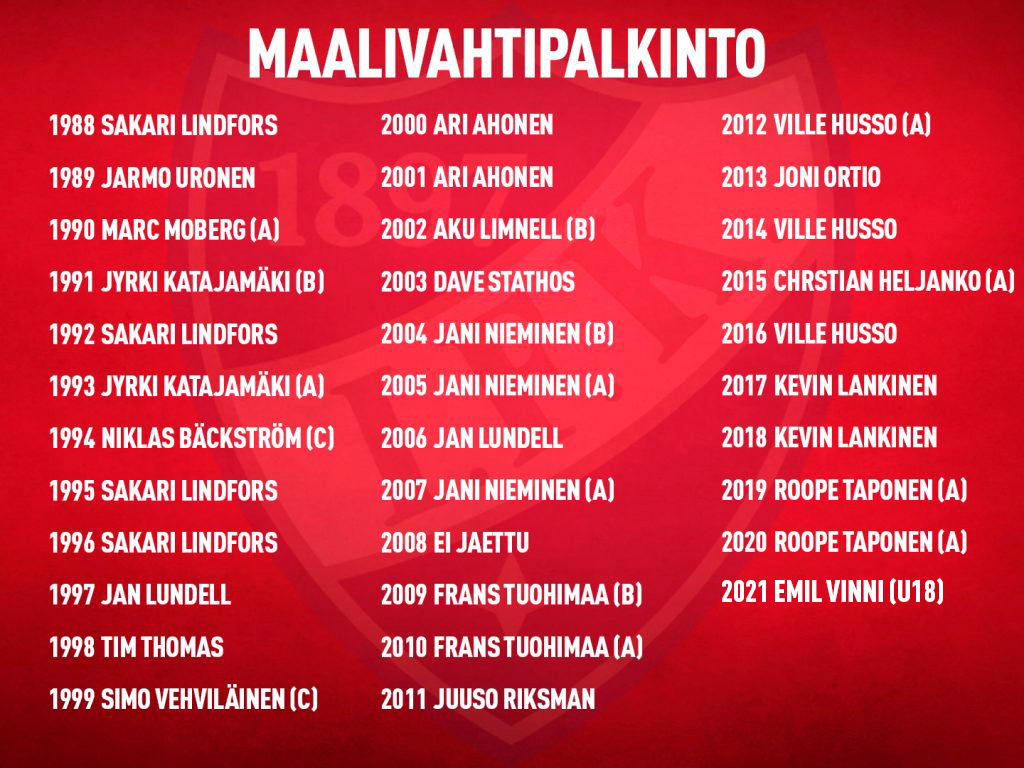 | 2016 | Ville Husso | Joonas Järvinen | Matt Generous | Roope Hintz | Ville Husso | Henrik Borgström |