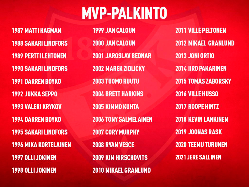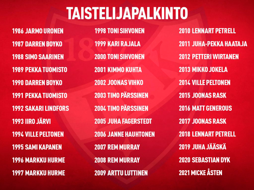 Ville Peltonen on puolestaan ainoa pelaaja, joka on palkittu kaikissa mahdollisissa kategorioissa (A-nuorten Gentleman 1991, tulokas 1993, taistelija 1994 & 2014, MVP 2011).