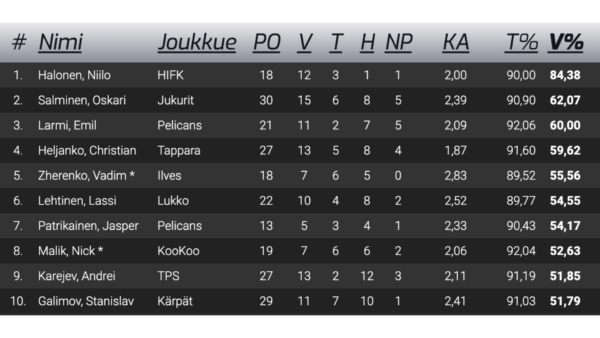 Torjuntavastuun Sportia vastaan kantaa sarjan parhaalla voittoprosentilla kiekkoja pysäyttävä Niilo Halonen. Yli kymmenen ottelua pelanneista maalivahdeista toiseksi parhaalla prosentilla otteluita on voittanut Jukurien Oskari Salminen.
