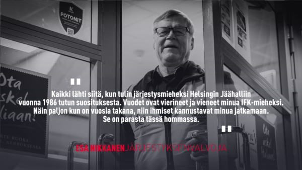 ”Kaikki lähti siitä, kun tulin järjestysmieheksi Helsingin Jäähalliin vuonna 1986 tutun suosituksesta. Molemmat IFK ja Jokerit pelasivat silloin vielä hallissa. Ainahan sitä töissä kotijoukkueen edustajana piti olla ovella ja sittenhän Jokerit jäivät pois. En sanoisi, että olen mikään fanaattinen kannattaja sinänsä. Mutta vuodet ovat vierineet ja vieneet minut tähän karsinaan IFK-mieheksi.