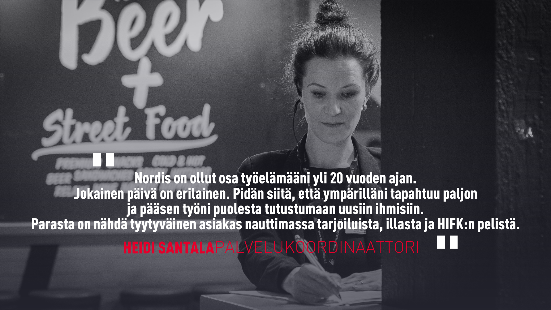 ”Elämäni ensimmäinen työpaikkani oli Nordiksen ravintolapuolen kioskeissa yli 20 vuotta sitten. Nordis on ollut osa työelämääni joko vakituisena tai osa-aikaisena työntekijänä siitä lähtien. Nykyään toimin jäähallilla Food&Events Tapahtumaravintoloiden palvelukoordinaattorina vastaten myyntipalvelun monista asiakaspalvelu- ja suunnittelutehtävistä.