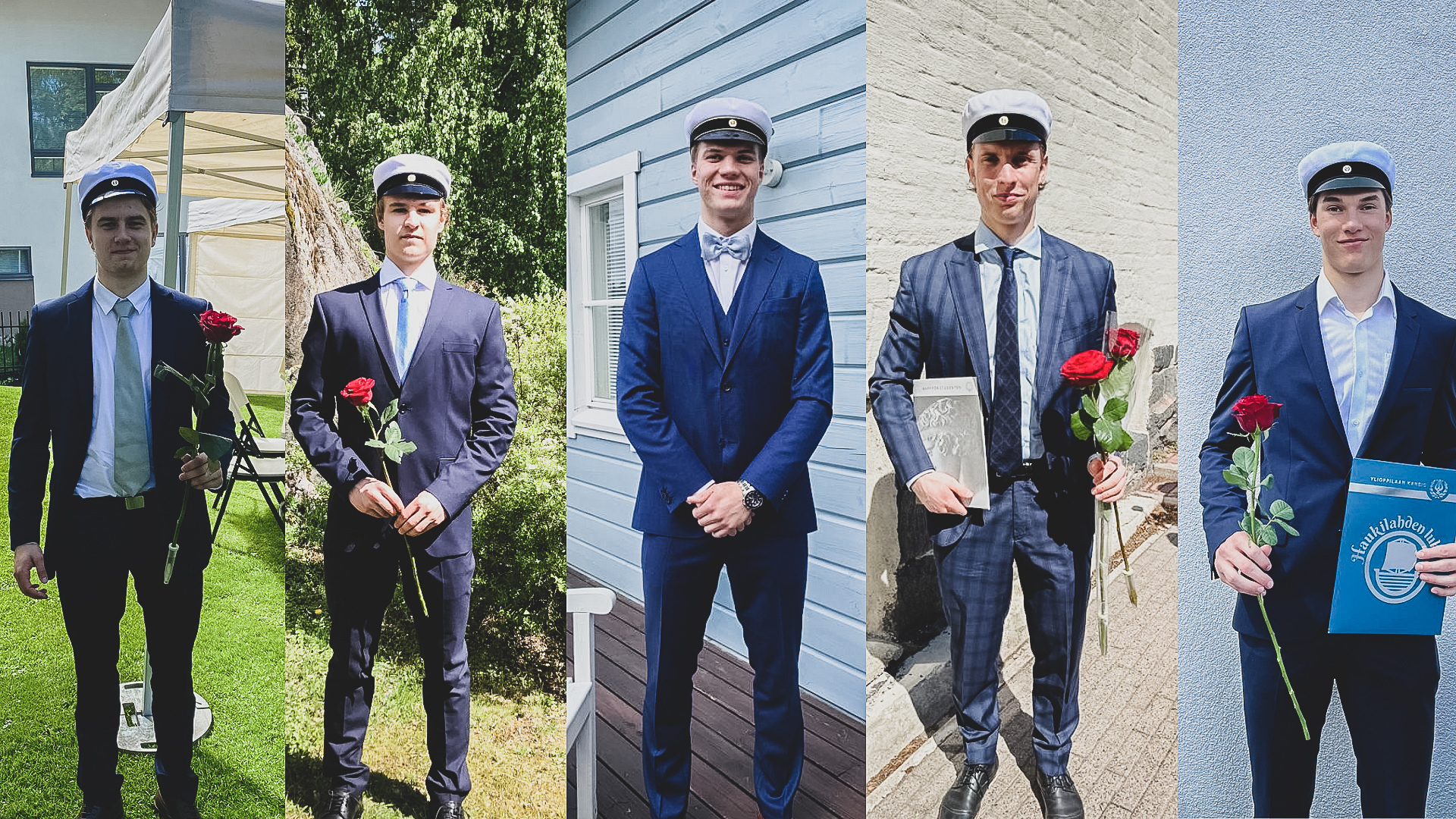 HIFK:n U20-joukkueesta, eli Kolleista, nyt keväällä ylioppilasjuhliaan viettiä viisi nuorta herrasmiestä: Veeti Kuhta, Oliver Holttinen, Jonni Kärkkäinen, Aku Koskenvuo ja Oskar Komarov.