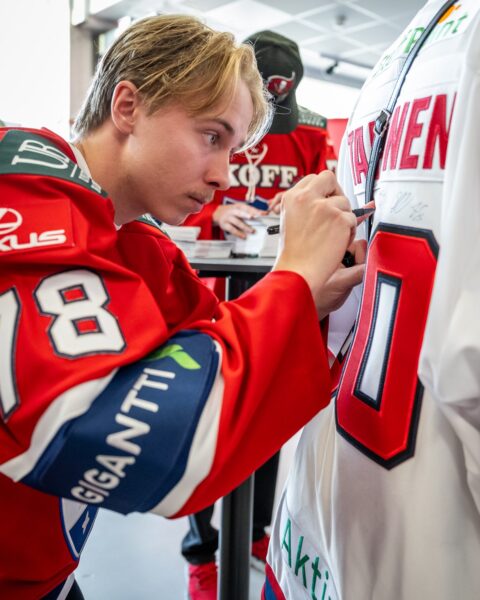 Aron Kiviharju antoi nimikirjoituksen pelipaitaan.