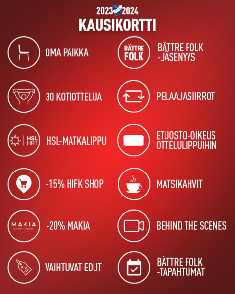 Kausikorttilaisena koet kaikki runkosarjan kotiottelut omalta paikaltasi. HIFK-sovelluksen kautta suoritettava mutkaton mobiilikausikortin jakaminen takaa myös, ettei paikkasi ole koskaan tyhjänä. Kausikorttilaiset pääsevät myös kiinni useisiin HIFK:n sekä seuran yhteistyökumppanien tarjoamiin etuihin. Tarkista kaikki kausikorttilaisen edut täältä.