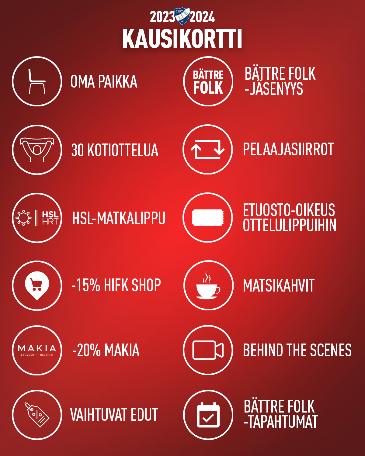 Kausikorttilaisena koet kaikki runkosarjan kotiottelut omalta paikaltasi. HIFK-sovelluksen kautta suoritettava mutkaton mobiilikausikortin jakaminen takaa myös, ettei paikkasi ole koskaan tyhjänä. Kausikorttilaiset pääsevät myös kiinni useisiin HIFK:n sekä seuran yhteistyökumppanien tarjoamiin etuihin. Tarkista kaikki kausikorttilaisen edut täältä.