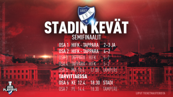 HIFK:n ja Tapparan välinen semifinaalisarja on edennyt viidenteen osaan. Stadilaiset pelaavat tänään Tampereella selkä seinää vasten Tapparan johtaessa sarjaa otteluvoitoin 3-1.