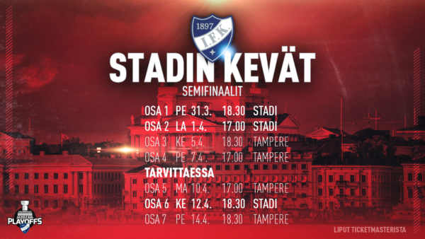 Stadilaisten ja Tapparan välisen semifinaalisarjan ensimmäinen osa pelataan tänään perjantaina Nordiksella. Matsi alkaa klo 18:30, etkot startataan Brewer’s Streetilla klo 17:00 DJ-Yuzan säestyksellä ja asiantuntijahaastatteluiden merkeissä.