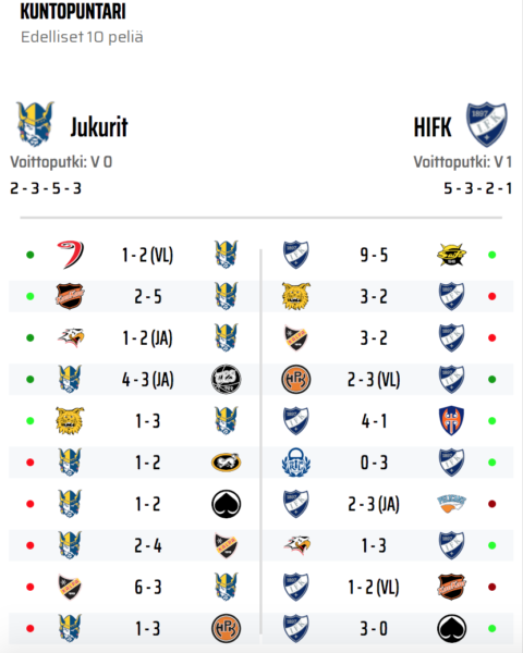 Keskinäiset kohtaamiset tältä kaudelta ovat kääntyneet kahdesti Jukurien eduksi. HIFK voitti joukkueiden edellisen keskinäisen Nordiksella joulukuussa lukemin 5–2.