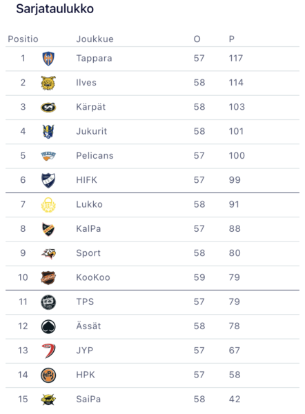 HIFK pelaa tänään perjantaina kolmanneksi viimeisen runkosarjaottelunsa. Isoista pisteistä Nordiksella kotijoukkueen kanssa vääntää tänään TPS. Stadilaiset pelaavat kotiedusta pudotuspeleihin, TPS viimeisistä paikoista kevään tosipeleihin.