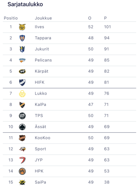 47 Leo Komarov – 44 Miro Väänänen – 41 Antti Pihlström