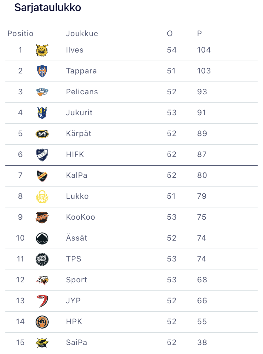 10 Kristian Vesalainen – 81 Iiro Pakarinen ”A” – 51 Juha Jääskä ”A”
