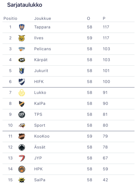 HIFK:lla on edelleen teoreettiset mahdollisuudet nousta kiinni pudotuspelien kotietuun ja parhaimmillaan runkosarjan kolmanneksi. Paikka kuuden sakissa ja neljännesfinaaleissa on varmistunut jo aiemmin tällä viikolla.