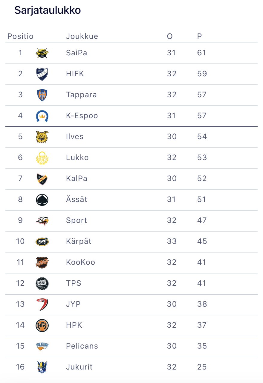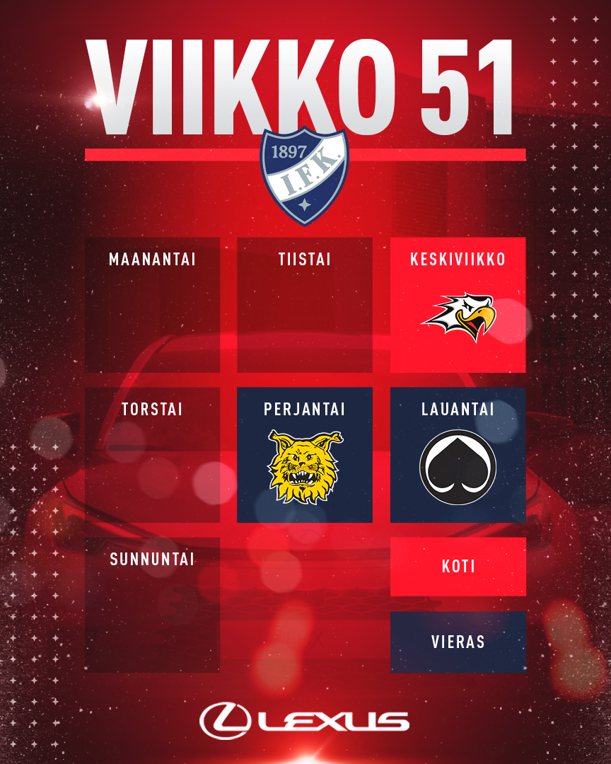 Viikonloppu käynnistyy perjantain myöhäisillan matsilla Ilveksen vieraana Tampereella. Lauantaina viikko paketoidaan Porissa Ässiä vastaan.