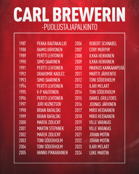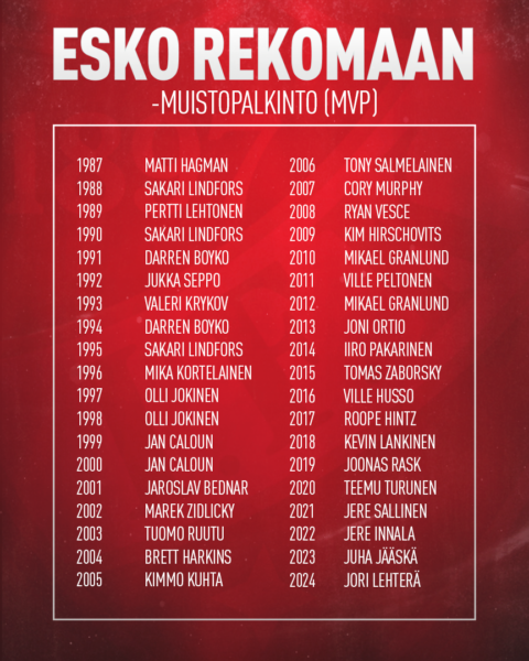 Ville Peltonen on puolestaan ainoa pelaaja, joka on palkittu kaikissa mahdollisissa kategorioissa (A-nuorten Gentleman 1991, tulokas 1993, taistelija 1994 & 2014, MVP 2011).