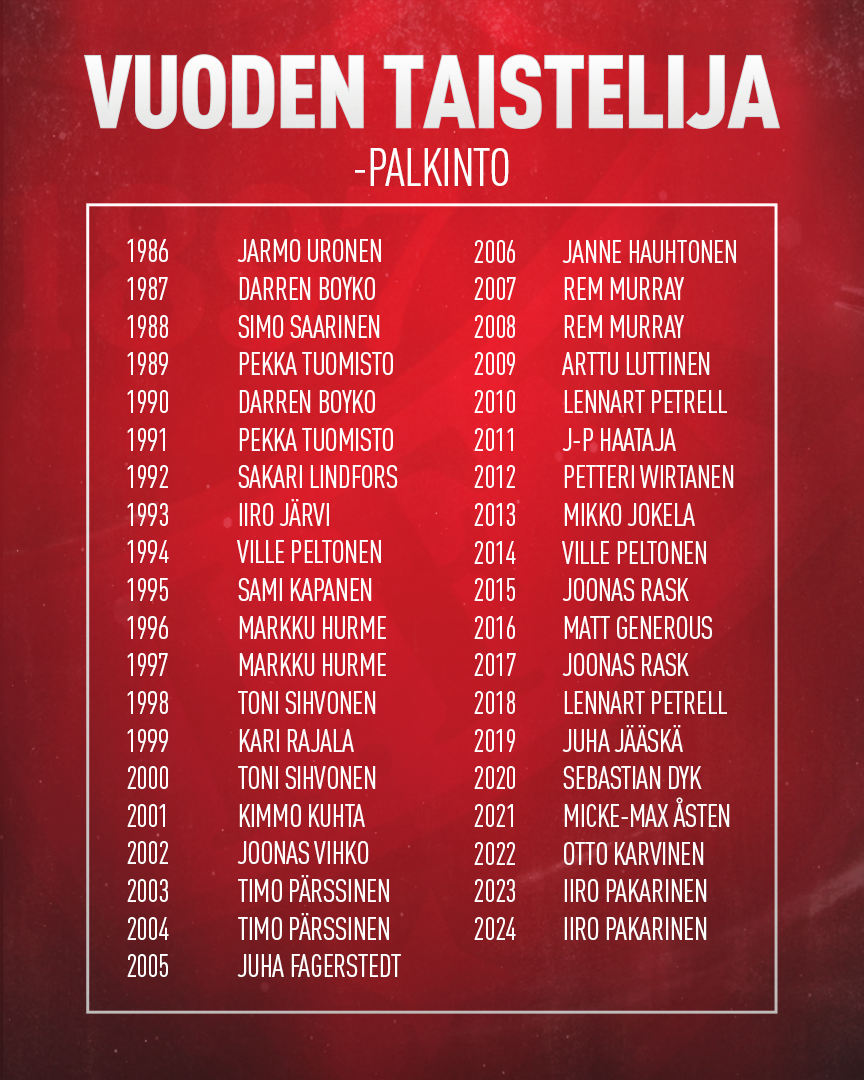 Ville Peltonen on puolestaan ainoa pelaaja, joka on palkittu kaikissa mahdollisissa kategorioissa (A-nuorten Gentleman 1991, tulokas 1993, taistelija 1994 & 2014, MVP 2011).