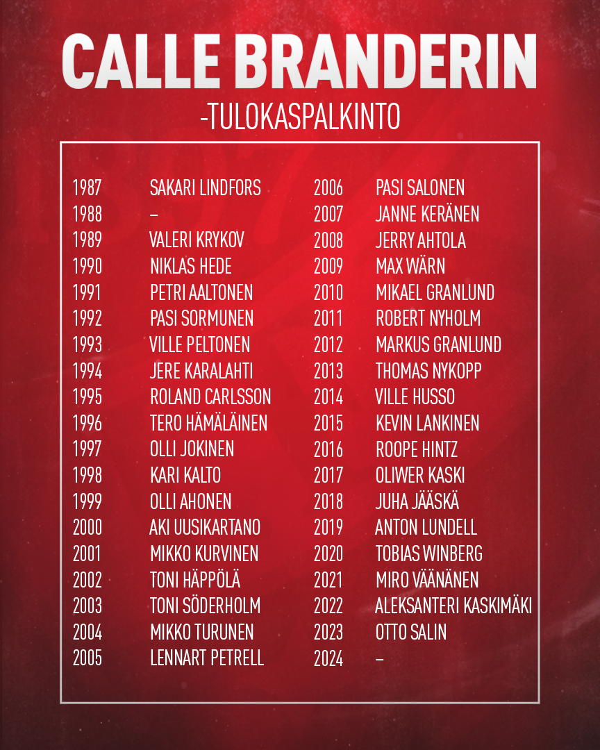 Calle Branderin tulokaspalkinto: ei jaettu tällä kaudella