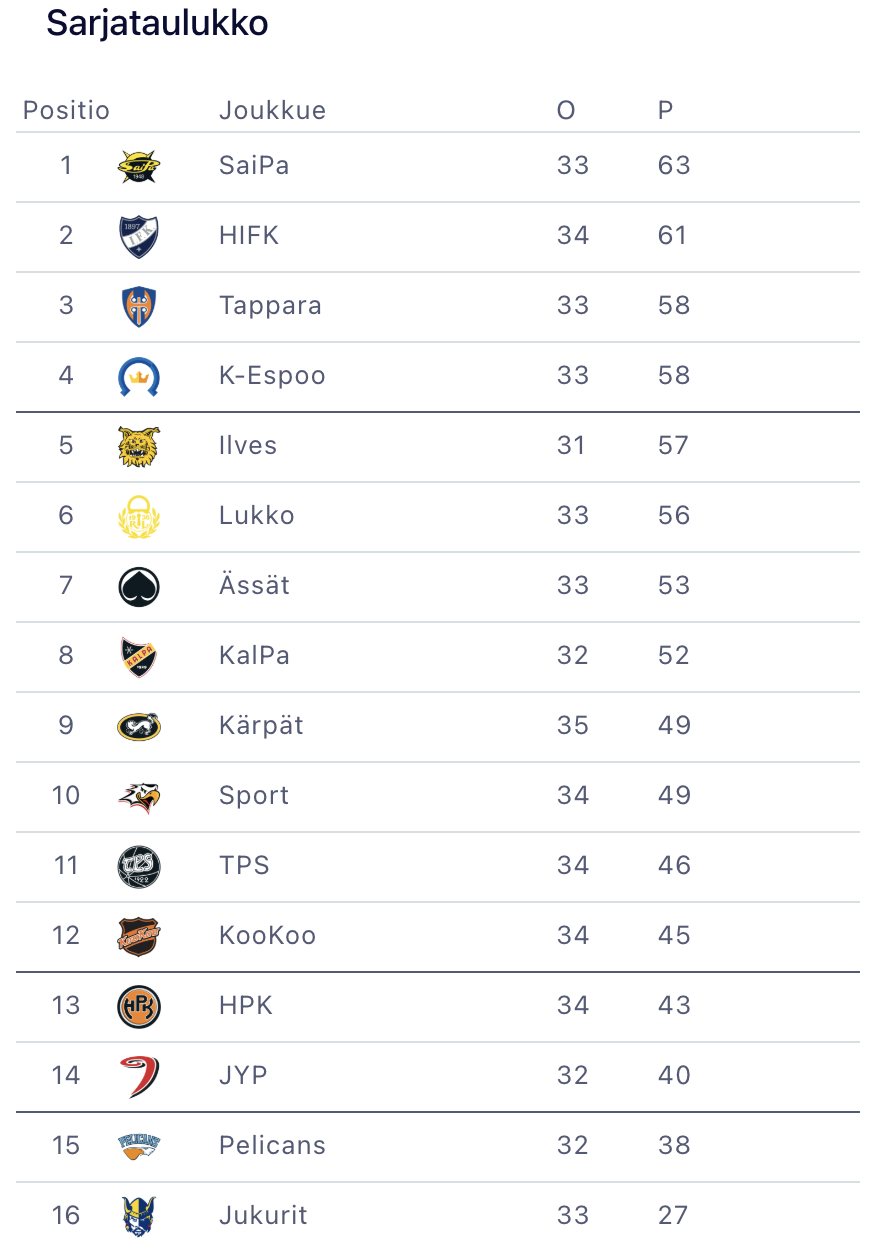 82 Aatu Karjalainen – 46 Jasper Kuhta – 37 Matias Vanhanen