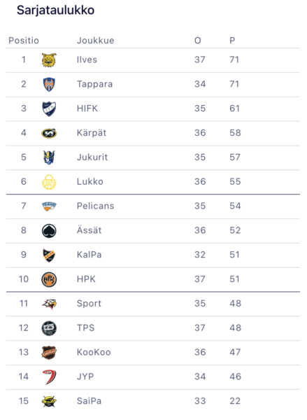 Loukkaantuneet / sairastuneet: Niko Seppälä (day-to-day), Einari Luhanka (1-2 viikkoa), Petteri Lindbohm (2 viikkoa), Kasper Kotkansalo (2 viikkoa), Leo Komarov (2-4 viikkoa), Aron Kiviharju (2 kuukautta)